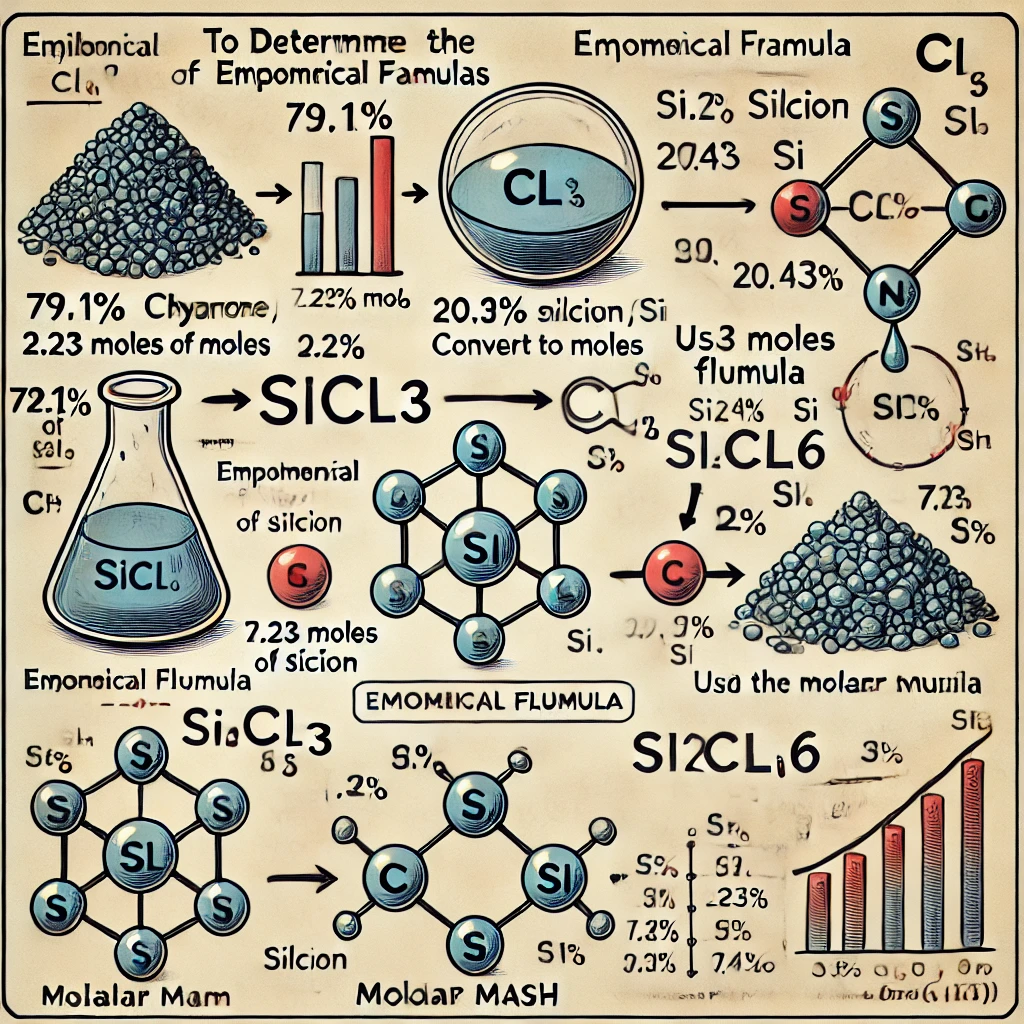 Here is the diagram showing the steps to determine the empirical and molecular formulas of the silicon chloride compound. T