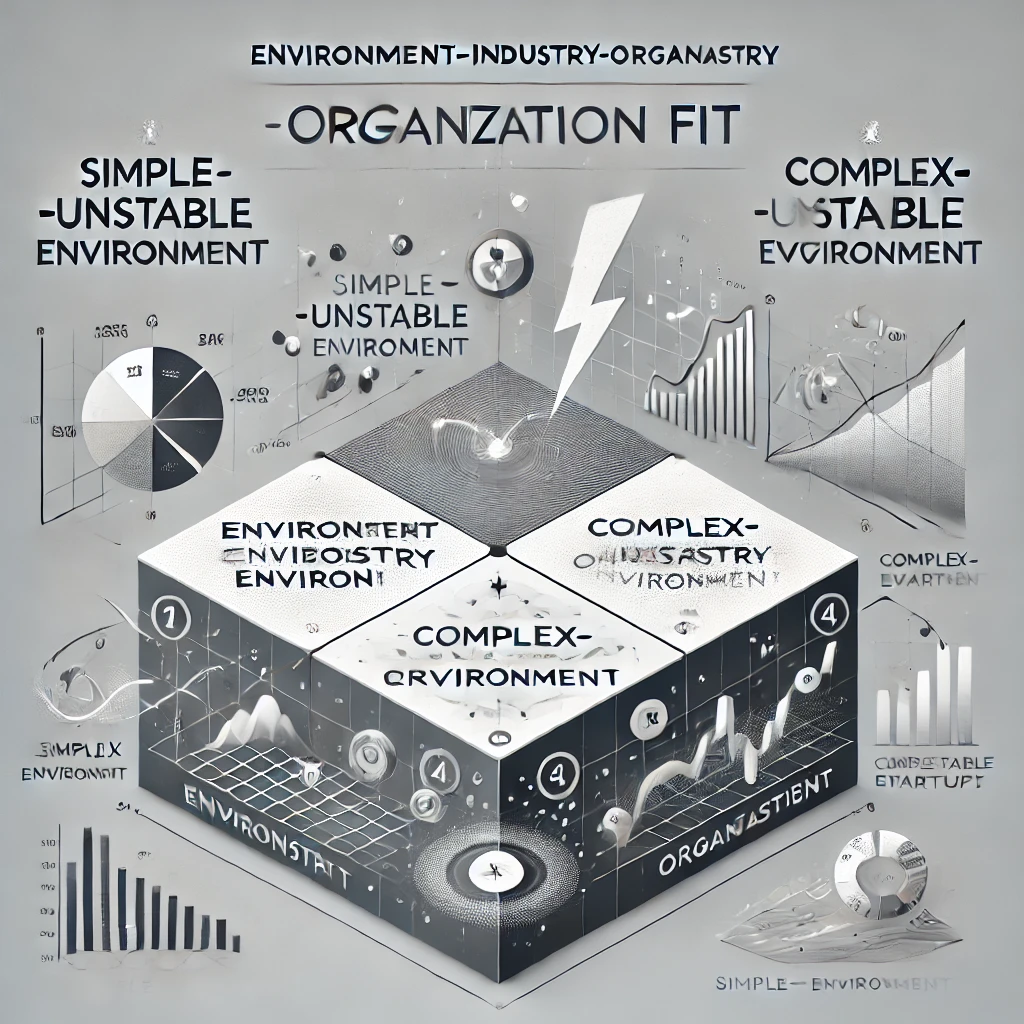 I’ve provided an image illustrating the Environment-Industry-Organization Fit Model, highlighting the Simple-Unstable Environment quadrant. Let me know if you need any modifications or further explanations!