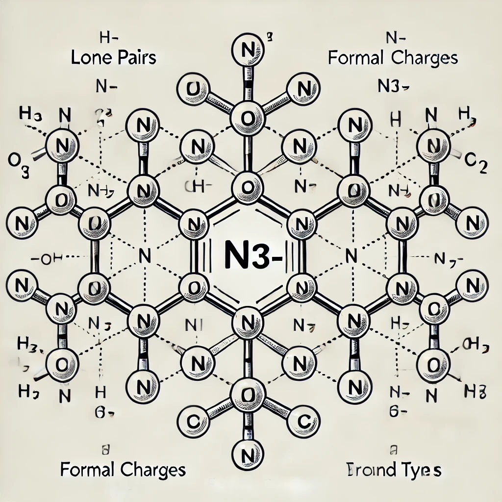 Here is the detailed diagram of the Lewis structure for the azide ion (N3−N_3^-), including resonance structures, lone pairs, formal charges, and bond types. Let me know if you need any modifications or further explanations!