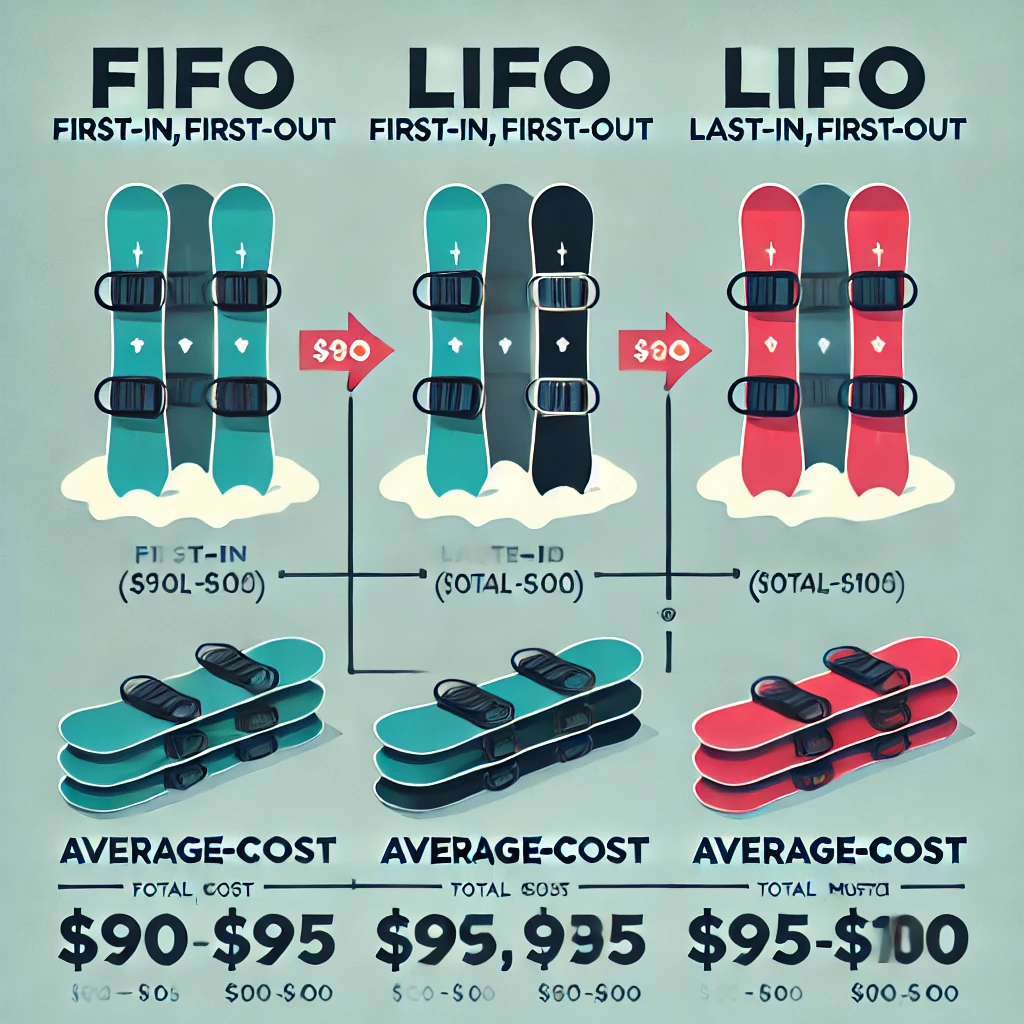 Here’s an educational infographic illustrating FIFO, LIFO, and Average-Cost methods with snowboards and cost flow arrows. Let me know if you need any modifications!