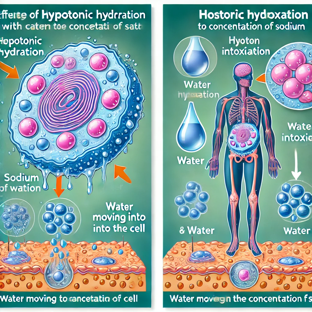 Here is the illustration showing the effects of hypotonic hydration at the cellular level. It visualizes the process of water moving into the cells, causing them to swell due to an imbalance in sodium concentration. This can help better understand how excessive water intake can lead to cellular disruption in hypotonic hydration.