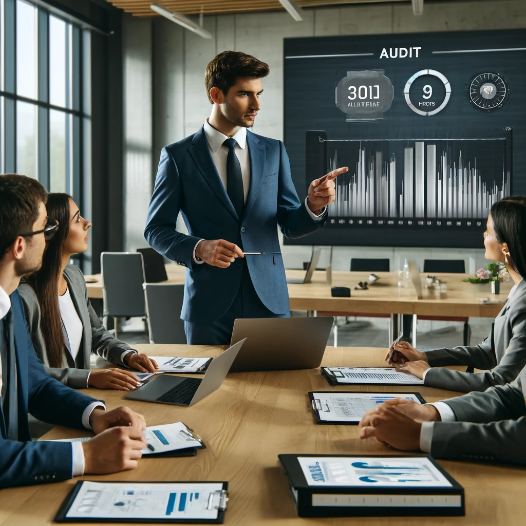 Generate an image of a professional auditor reviewing financial documents and discussing compliance measures with a business team in a modern office setting. Include a digital dashboard displaying audit metrics on a screen in the background.