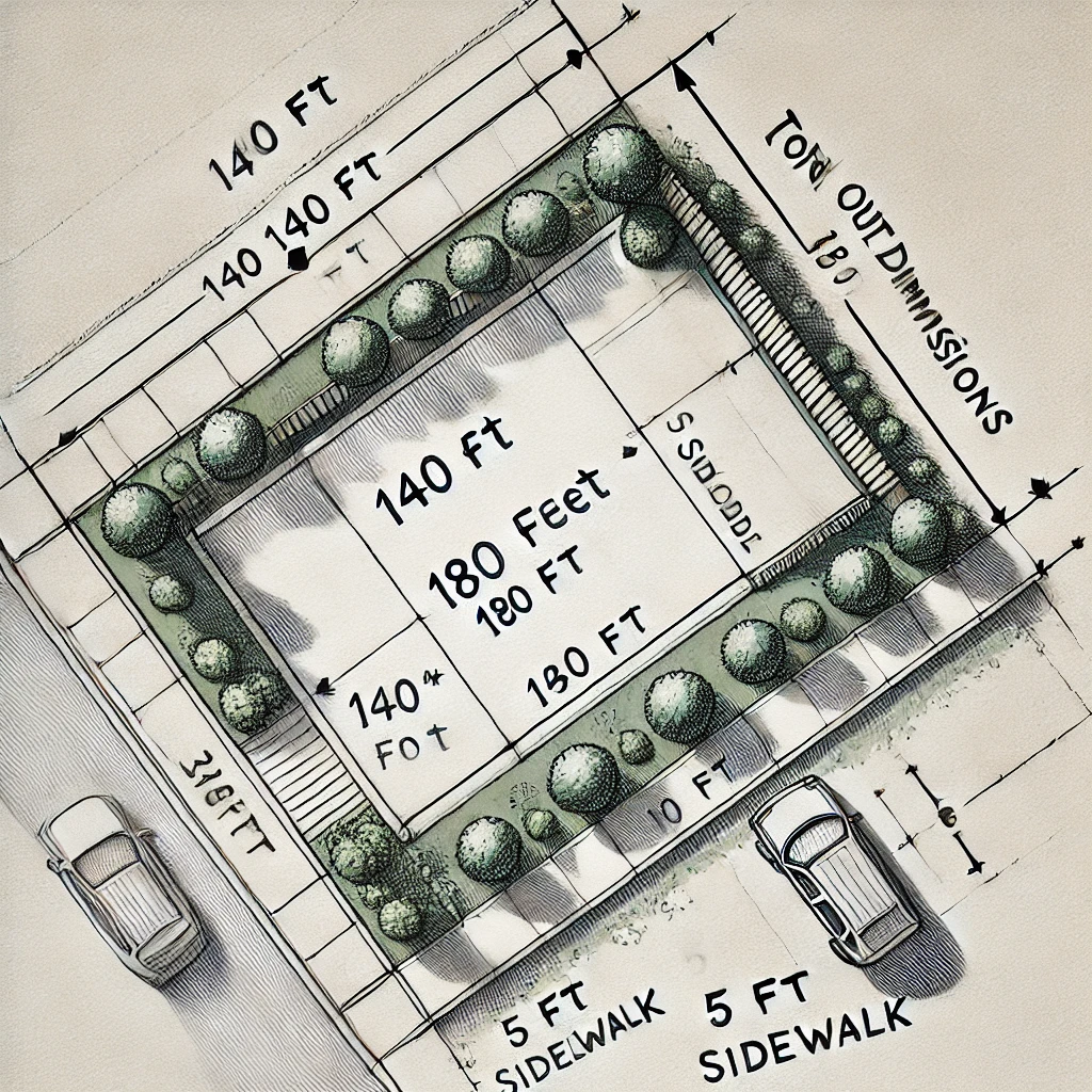 - The sidewalk surrounds a rectangular lot measuring 140 ft × 180 ft.