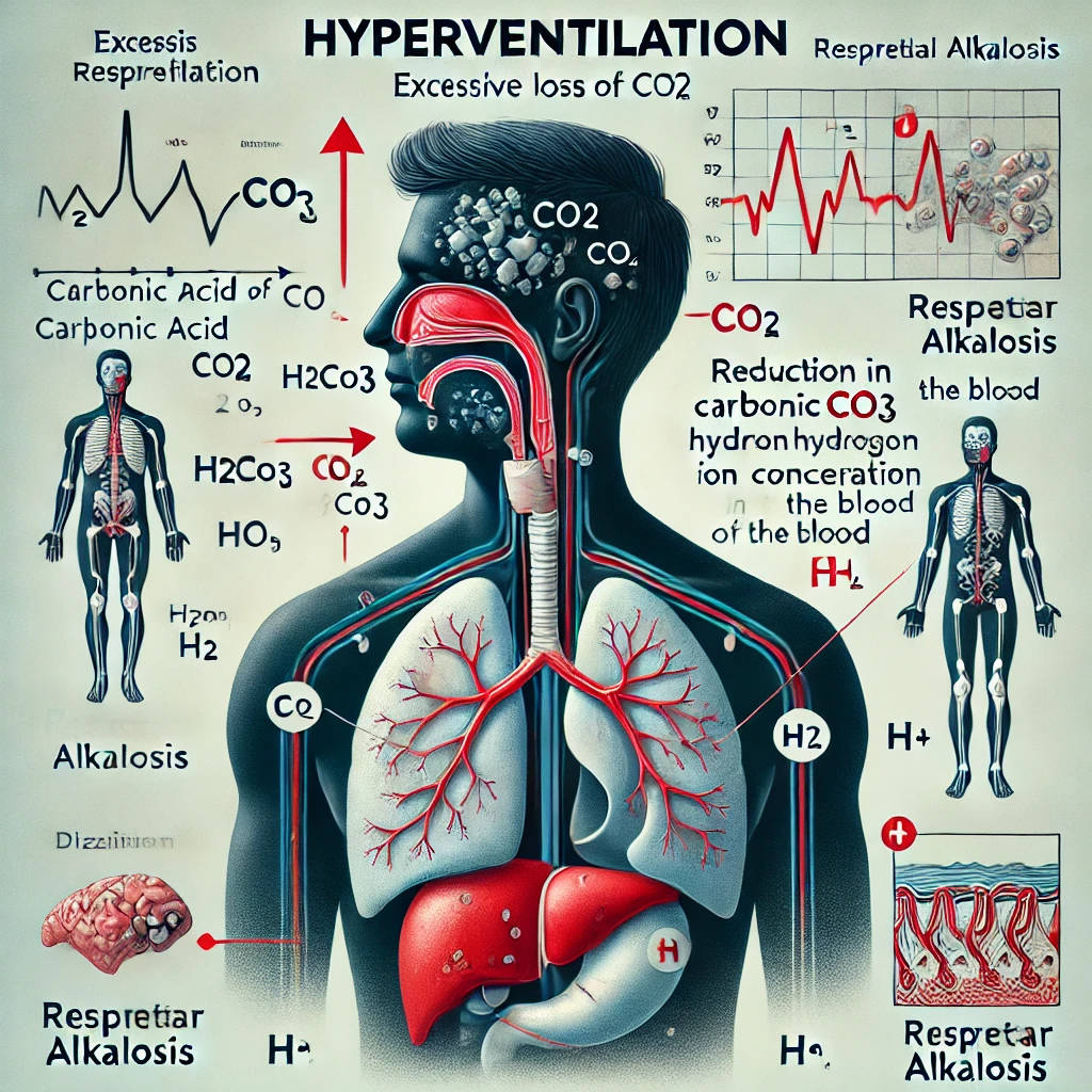 Hyperventilation is a condition in which a person breathes too rapidly and deeply, leading to an excessive loss of carbon dioxide (CO₂) from the blood. This happens because CO₂ is expelled faster than the body can produce it, disrupting the normal acid-base balance.