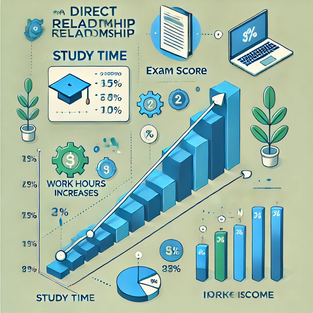 For example, consider the relationship between studying time and exam scores. If a student spends more time studying, their exam scores are likely to increase. This suggests a direct relationship because both variables move in the same direction. Similarly, the relationship between the number of hours worked and total income earned is also direct: as the number of work hours increases, total income also rises.