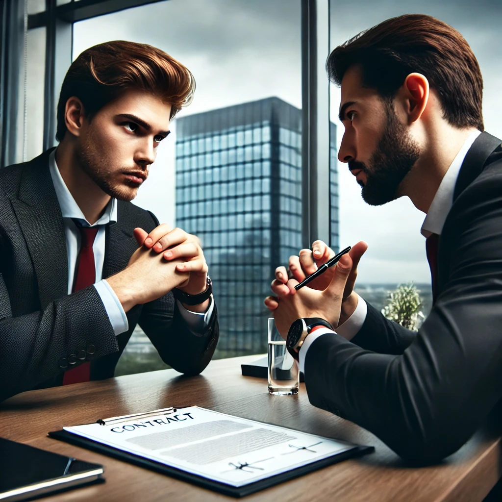 Here is an image representing a distributive bargaining negotiation, where two individuals are engaged in a competitive discussion over a contract. Let me know if you need any modifications!