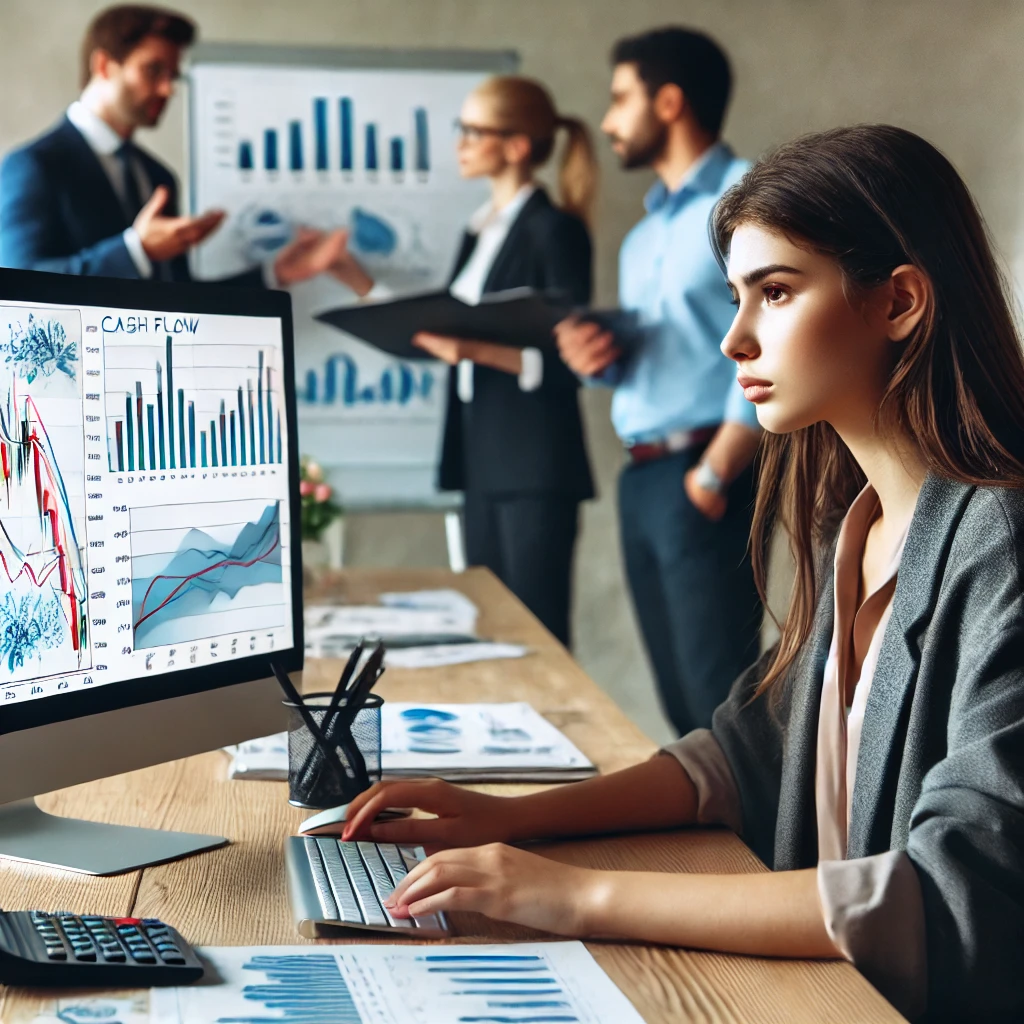 Here is an image depicting a business analyst analyzing financial charts and cash flow projections, concerned about discrepancies in the forecast. In the background, a team discusses project risks with graphs and data on a whiteboard. Let me know if you need any modifications!
