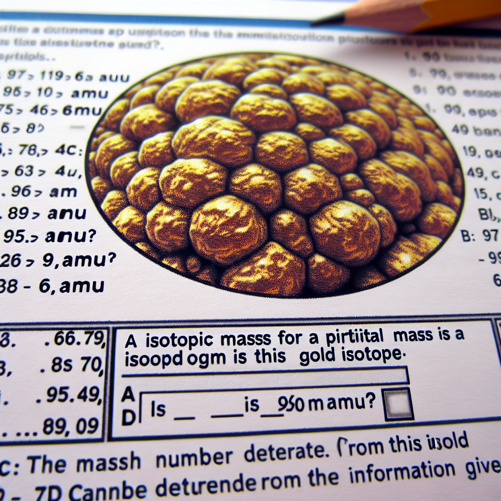 1. Isotopic Mass: The isotopic mass is the weighted average mass of an isotope of an element. It is measured in atomic mass units (amu). In this case, the isotopic mass of the gold isotope is 196.9665 amu.