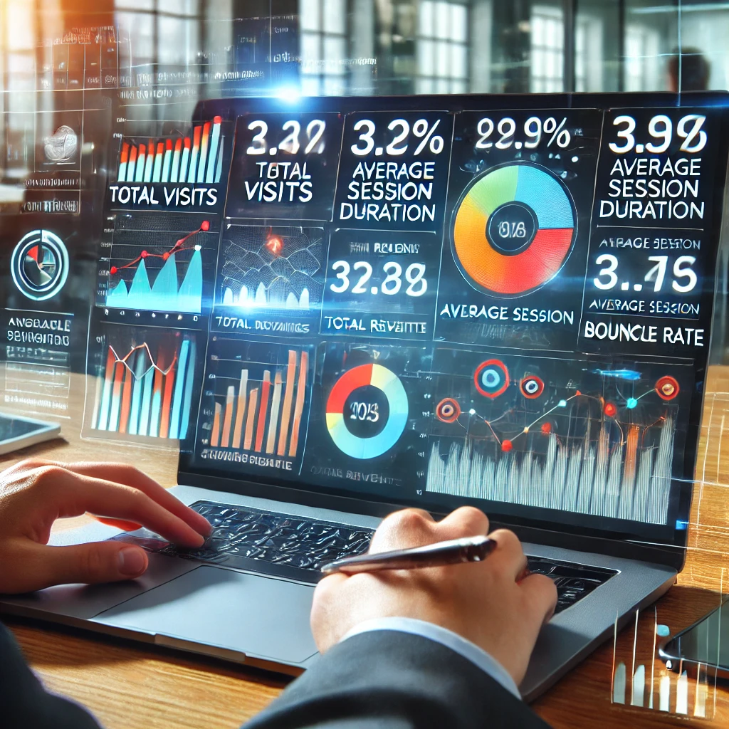 Here is an image of a digital dashboard displaying website analytics, including total visits, total revenue, average session duration, and bounce rate. Let me know if you need any modifications or further explanations!
