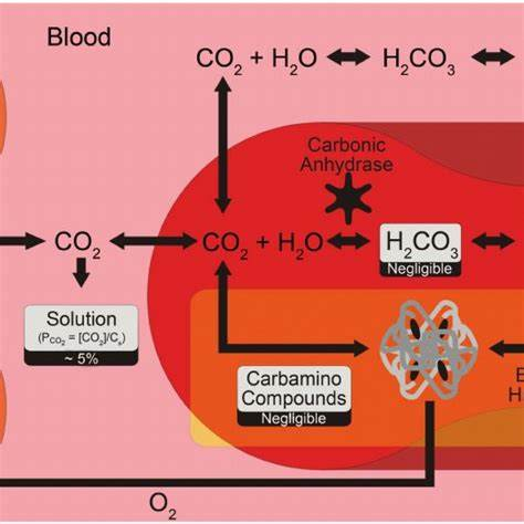The hydrogen ions produced bind to hemoglobin, forming deoxyhemoglobin, which helps buffer the blood and facilitates oxygen release to tissues (the Bohr effect). When blood reaches the lungs, oxygen binds to hemoglobin, promoting the release of H⁺ ions. These hydrogen ions react with bicarbonate ions to form carbonic acid, which then dissociates into CO₂ and water. The CO₂ is then exhaled.