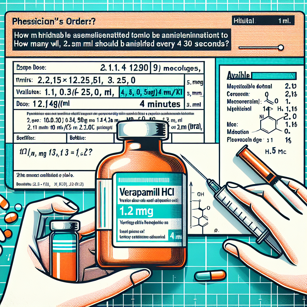 Verapamil is a calcium channel blocker used for treating arrhythmias, hypertension, and angina. It is essential to administer it slowly to prevent adverse effects like hypotension or bradycardia. The ordered dose is 12 mg, and the available concentration is 2.5 mg/mL, so 4.8 mL must be given over 4 minutes. Dividing this volume evenly over the timeframe ensures safe administration. Every 30 seconds, 0.6 mL should be pushed IVP.