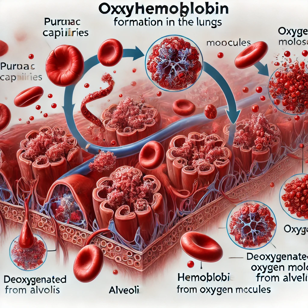 Oxyhemoglobin formation is a critical step in the respiratory process, allowing oxygen transport from the lungs to body tissues. This process occurs during external respiration, specifically in the alveoli of the lungs. Oxygen from inhaled air diffuses across the alveolar membrane into the pulmonary capillaries, where it binds to the iron-containing heme groups in hemoglobin molecules inside red blood cells.