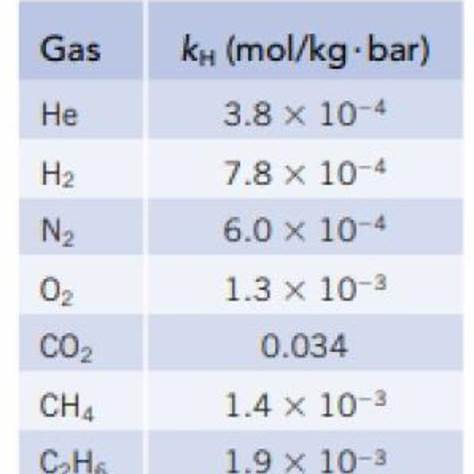 For the gases in question, the Henry’s law constants in water at 25°C are as follows: