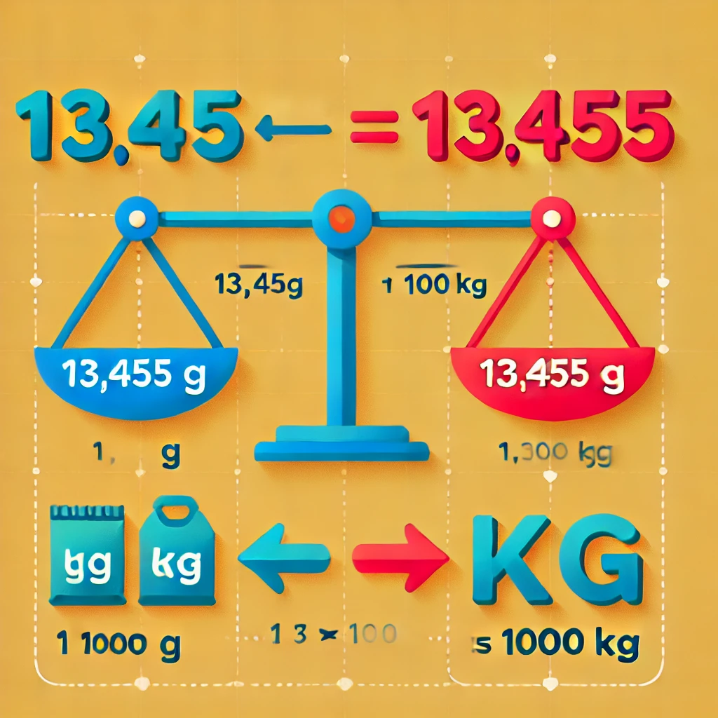 13,455 \div 1,000 = 13.455 \, \text{kg}