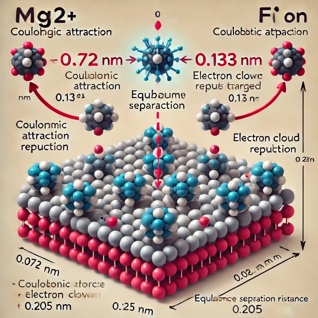 When the magnesium and fluoride ions come close together, they experience both attractive (Coulombic) and repulsive (quantum mechanical) forces. The attractive force is due to the opposite charges, and the repulsive force arises from electron cloud overlap. At equilibrium, these forces balance, preventing further movement toward or away from each other. This balance determines the ionic bond length and strength in magnesium fluoride (MgF₂).