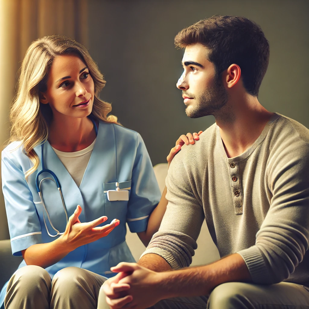 Here is an image representing therapeutic communication between a mental health nurse and a patient with schizophrenia. Let me know if you need any modifications or further assistance!
