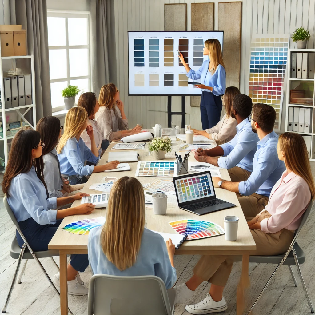 Here is the image of the teachers discussing the color palettes for the school interior painting project. Let me know if you need any modifications!