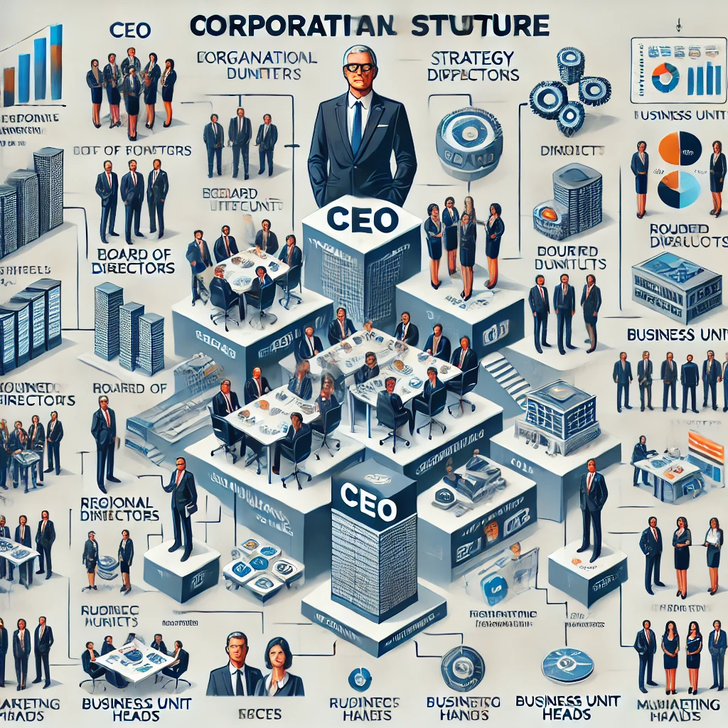 Here’s an image illustrating a corporate organizational structure with multiple levels of strategy-making. It highlights how different business units, regional managers, and functional departments contribute to strategic decisions in a large corporation. Let me know if you’d like any modifications!