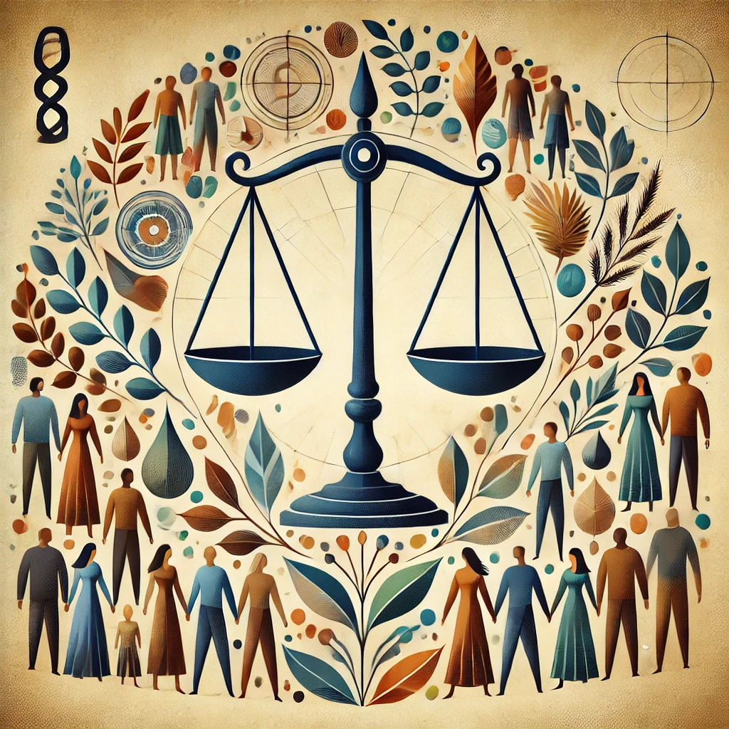 Here is the symbolic representation of the Universalist Principle. It features a balanced scale in the center to symbolize fairness and equality, with diverse individuals surrounding it to represent inclusivity. Let me know if you need any modifications!