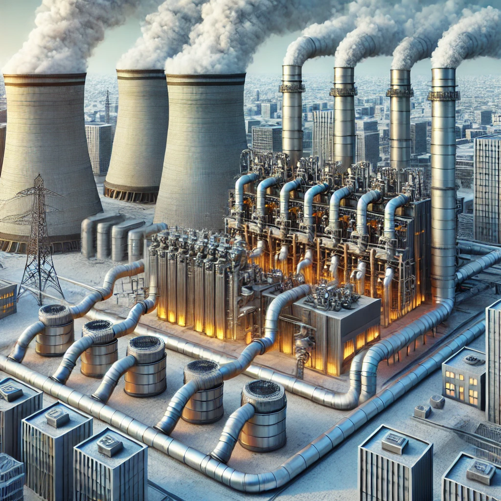 A coal-fired power plant captures waste heat and uses it to heat adjacent buildings.