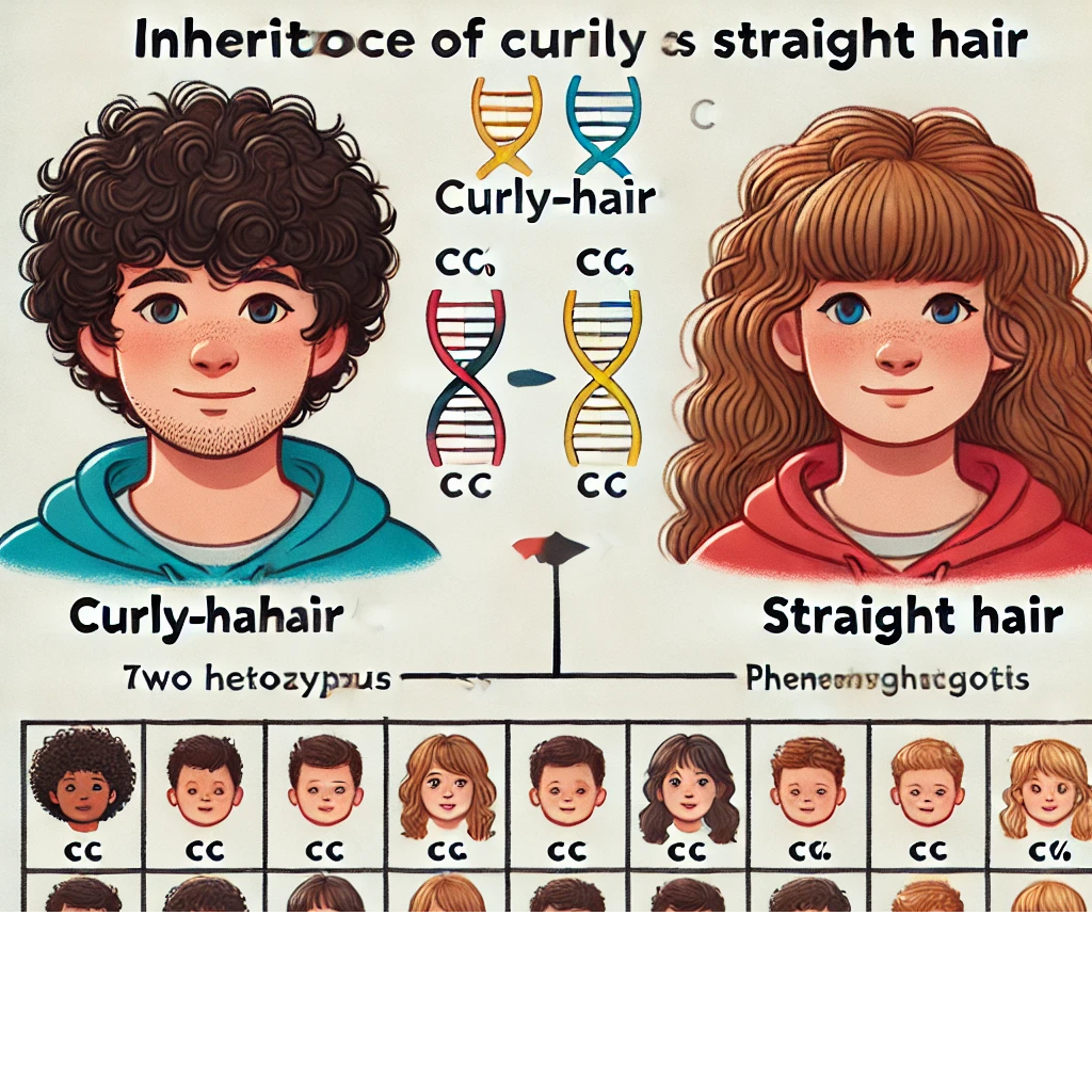 The inheritance of curly hair follows Mendelian genetics, where curly hair (C) is dominant over straight hair (c). When two heterozygous (Cc) individuals reproduce, we can use a Punnett square to determine the probability of different genotypes and phenotypes among their offspring.