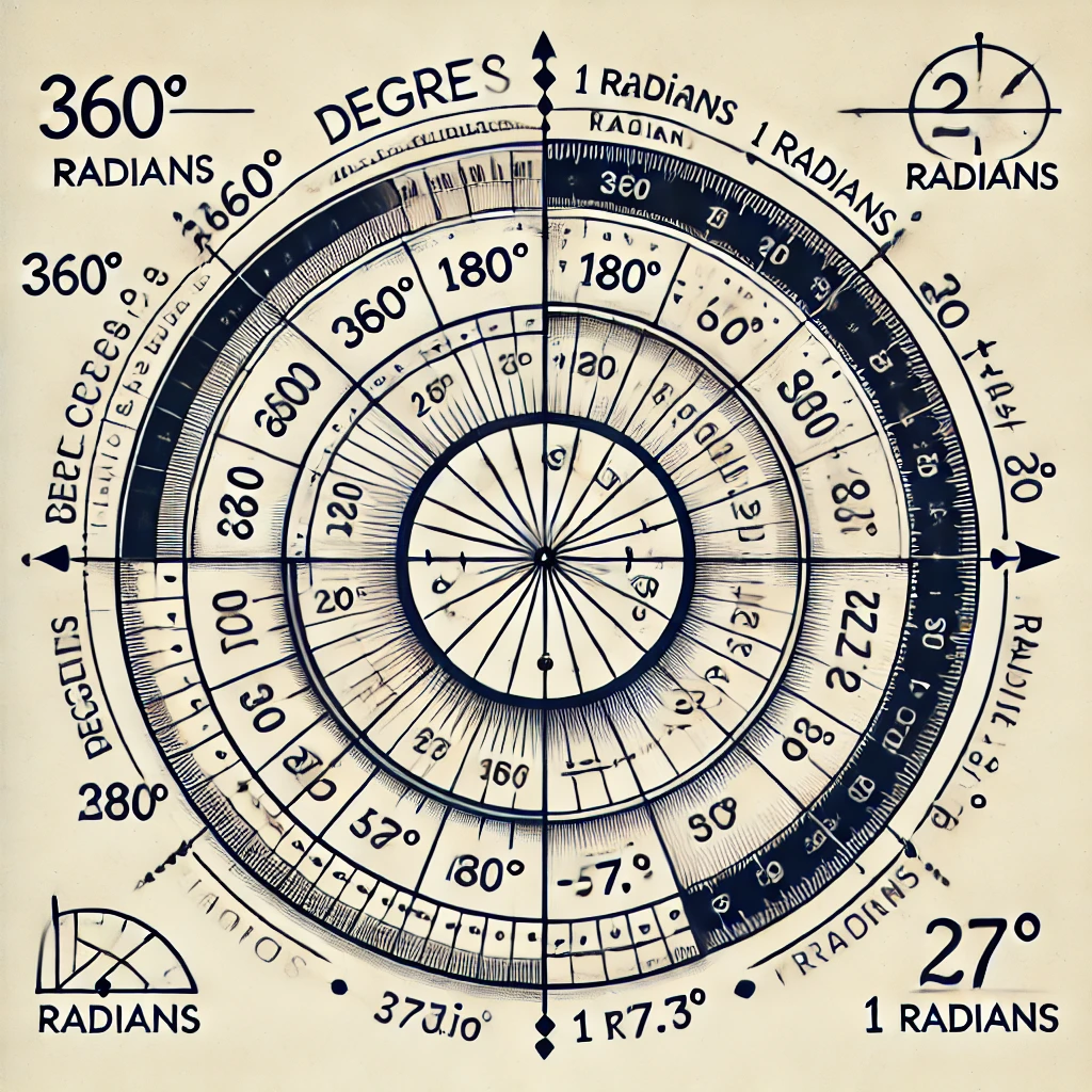 Here is an image generated with DALL·E to visually represent the relationship between degrees and radians in a circle. It includes key labels such as 360° = 2π radians, 180° = π radians, and the concept of 1 radian being approximately 57.3°.
