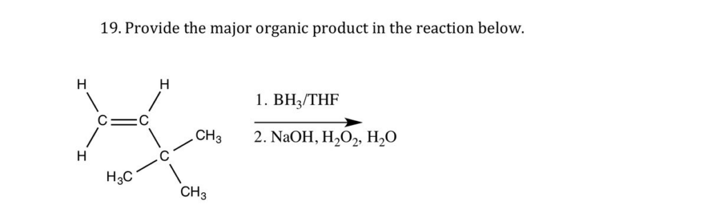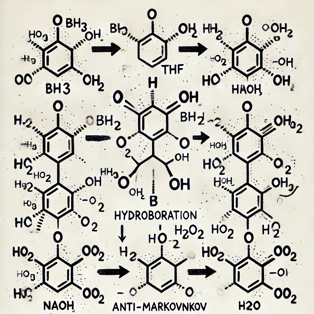 - BH₃/THF (Borane-Tetrahydrofuran Complex) – This step leads to the addition of boron and hydrogen across the double bond.