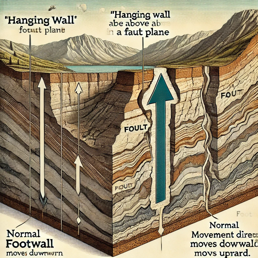 A fault is a fracture in the Earth’s crust where rocks on either side have moved relative to each other. The terms footwall and hanging wall are used to describe the blocks of rock on either side of an inclined fault plane.