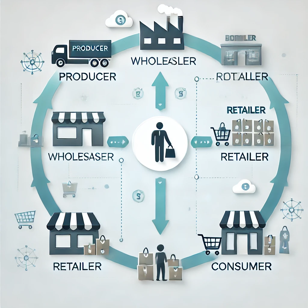 Generate an illustration showing the flow of a product from a producer (factory) through intermediaries (like wholesalers and retailers) to the consumer (customer). Use labeled arrows to show the process, including each step: Producer → Wholesaler → Retailer → Consumer. The image should have a clean, modern business infographic style.