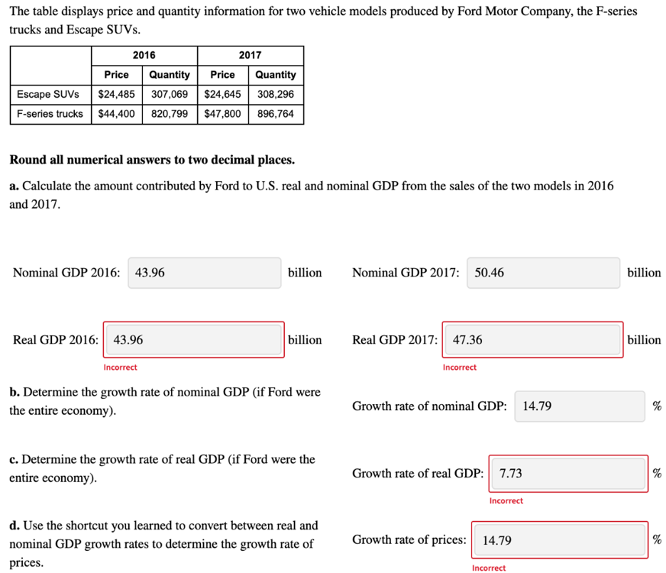 The table displays price and quantity information for two vehicle models produced by Ford Motor Company, the F-series trucks and Escape SUVs. 2016 2017 Price Price Quantity Quantity 307,069 Escape SUVs $24,485 $24,645 308,296 F-series trucks $44,400 820,799 $47,800 896,764 Round all numerical answers to two decimal places. a. Calculate the amount contributed by Ford to U.S. real and nominal GDP from the sales of the two models in 2016 and 2017. Nominal GDP 2016: 43.96 billion Nominal GDP 2017: 50.46 billion Real GDP 2016: 43.96 billion Real GDP 2017: 47.36 billion Incorrect Incorrect b. Determine the growth rate of nominal GDP (if Ford were the entire economy). Growth rate of nominal GDP: 14.79 % c. Determine the growth rate of real GDP (if Ford were the entire economy). Growth rate of real GDP: 7.73 % Incorrect d. Use the shortcut you learned to convert between real and nominal GDP growth rates to determine the growth rate of prices. Growth rate of prices: 14.79 % Incorrect