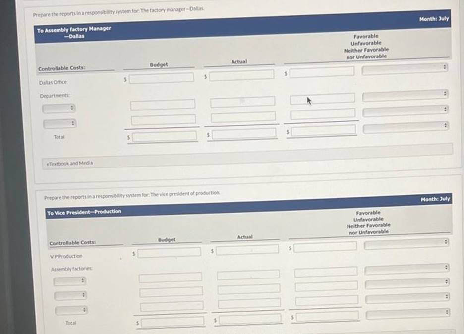 The Assembly Factory Manager is directly responsible for the Dallas office’s performance. Thus, their report reflects the full cost data and shows the unfavorable variance. Similarly, the Vice President – Production oversees broader operations, including the Dallas factory and other potential facilities. The VP’s report aggregates data at a higher level but reflects the same unfavorable variance if no additional factory data is provided.