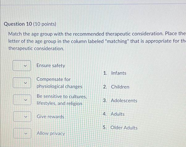 Match the age group with the recommended therapeutic consideration. Place the letter of the age group in the column labeled “matching” that is appropriate for the therapeutic consideration.