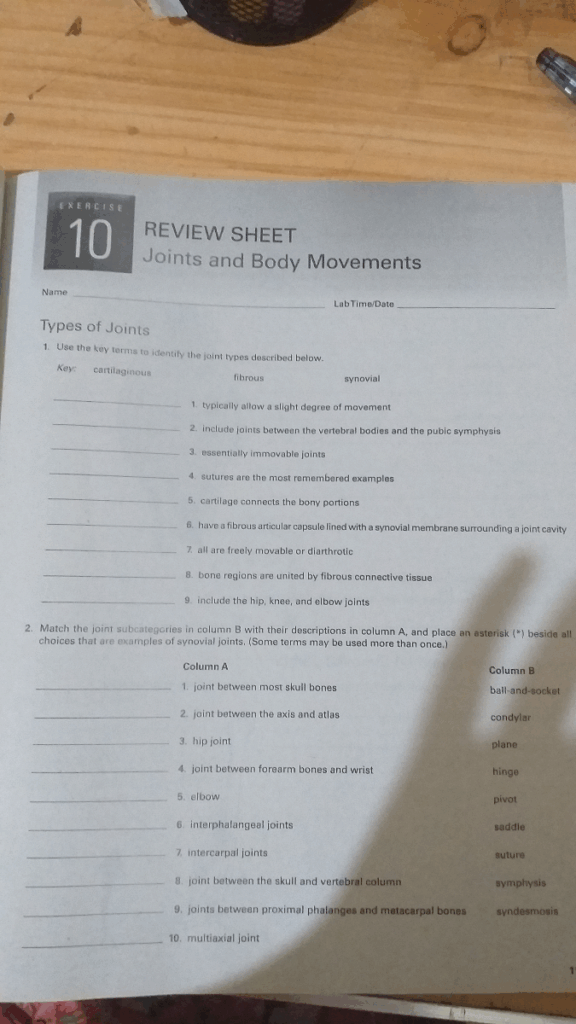 key terms to identify the joint types described below. Key: cartilaginous, fibrous 1. typically allow a slight degree of movement. 2. include joints between the vertebral bodies and the pubic symphysis. 3. essentially immovable joints. 4. sutures are the most remembered examples. 5. cartilage connects the bony portions. 6. have a fibrous articular capsule lined with a synovial membrane surrounding a joint cavity. 7. all are freely movable or diarthrotic. 8. bone regions are united by fibrous connective tissue. 9. include the hip, knee, and elbow joints. 2. Match the joint subcategories in column B with their descriptions in column A, and place an asterisk (*) beside all choices that are examples of synovial joints. (Some terms may be used more than once.) Column A 1. joint between most skull bones 2. joint between the axis and atlas 3. hip joint 4. joint between forearm bones and wrist 5. elbow 6. interphalangeal joints 7. intercarpal joints 8. joint between the skull and vertebral column 9. joints between proximal phalanges and metacarpal bones 10. multiaxial joint Column B ball-and-socket condylar plane hinge pivot saddle suture symphysis syndesmosis