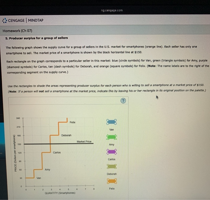 The given graph shows a stepwise supply curve for six sellers (Van, Amy, Carlos, Deborah, Felix), each offering one smartphone. The horizontal black line at $150 indicates the current market price.