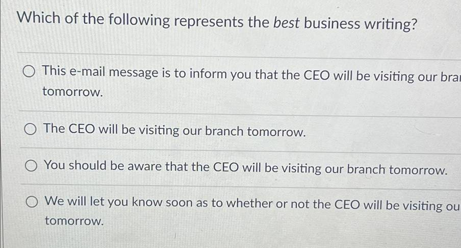 In summary, concise and clear communication fosters efficiency and professionalism in the business environment. “The CEO will be visiting our branch tomorrow” fulfills these criteria best and thus represents the best business writing among the options.
