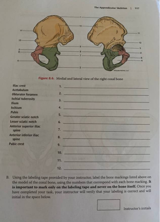 Lab 8 SECTION 3: Bones And Bone Markings Of The Pelvic Girdle A. Label Figure 8.5 And 8.6 With The Correct Anatomical Term Using The List Of Terms Provided. You Will Also Be Required To Identify Each Part On A Disarticulated Skeleton. Refer To Your Text- Book As A Guide. Sacroillac Joint 10 Sacrum 3 2 ?????s 8 9 Symphysis Pubis CMC Pubic Arch Anterior View