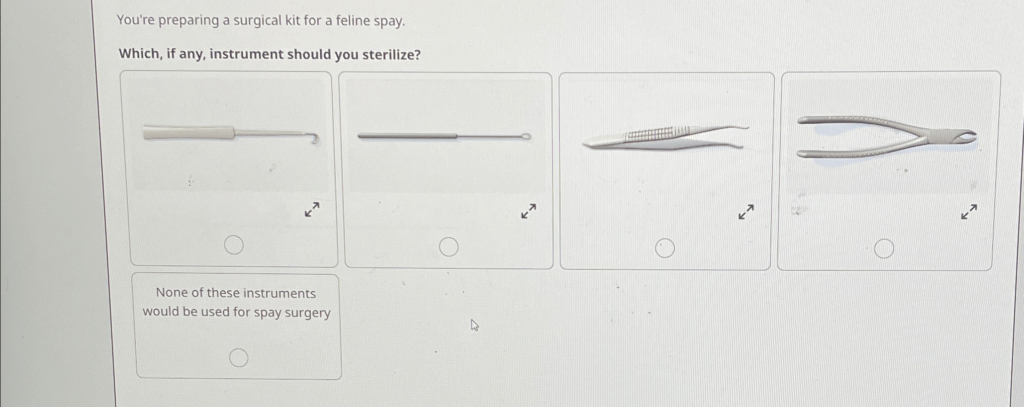 You’re preparing a surgical kit for a feline spay. Which, if any, instrument should you sterilize? None of these instruments would be used for spay surgery.