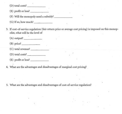 If cost-of-service regulation (fair-return price or average cost pricing) is imposed on this monopolist, what will be the level of (A) output? (B) price? (C) total revenue? (D) total costs? (E) profit or loss? (F) Will the monopoly need a subsidy? (G) If so, how much? 4. What are the advantages and disadvantages of marginal cost pricing? 5. What are the advantages and disadvantages of cost-of-service regulation?