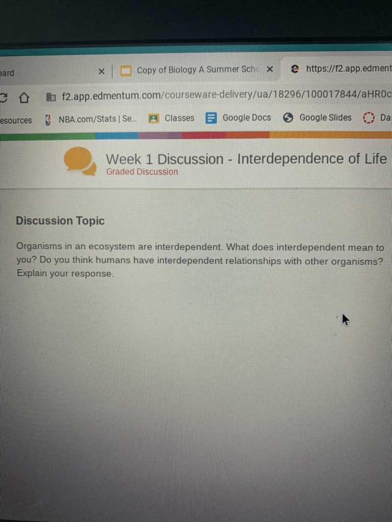 Organisms in an ecosystem are interdependent. What does interdependent mean to you? Do you think humans have interdependent relationships with other organisms? Explain your response.