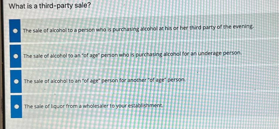 A third-party sale refers to a situation where alcohol is legally sold to someone who is of legal drinking age, but that person intends to provide the alcohol to someone who is not of legal age. This is often referred to as a “proxy sale” and is illegal in most jurisdictions, as it undermines laws that are meant to prevent underage drinking.