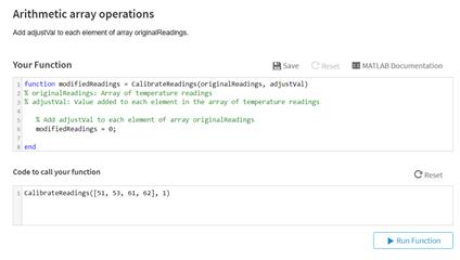 modifiedReadings = 0;, was incorrect. This line simply setsmodifiedReadingsto 0, which does not apply the adjustment to each element of the input array. The correct operation ismodifiedReadings = originalReadings + adjustVal;. MATLAB allows element-wise operations on arrays, so adding a scalar (adjustVal) to a vector (originalReadings) results in a new vector where the scalar is added to each element. - Example: When the function is called as