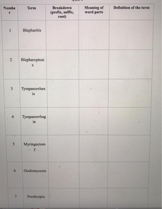 | Number | Term | Breakdown (prefix, suffix, root) | Meaning of Word Parts | Definition of the Term |