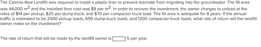 The Camino Real Landfill was required to install a plastic liner to prevent leachate from migrating into the groundwater. The fill area was 44,000 m2 and the installed liner cost was $8 per m2. In order to recover the investment, the owner charges to unload at the rates of $14 per pickup, $25 per dump truck, and $70 per compactor truck load. The fill area is adequate for 8 years. If the annual traffic is estimated to be 2500 pickup loads, 650 dump-truck loads, and 1200 compactor-truck loads, what rate of return will the landfill owner make on the investment? The rate of return that will be made by the landfill owner is % per year.