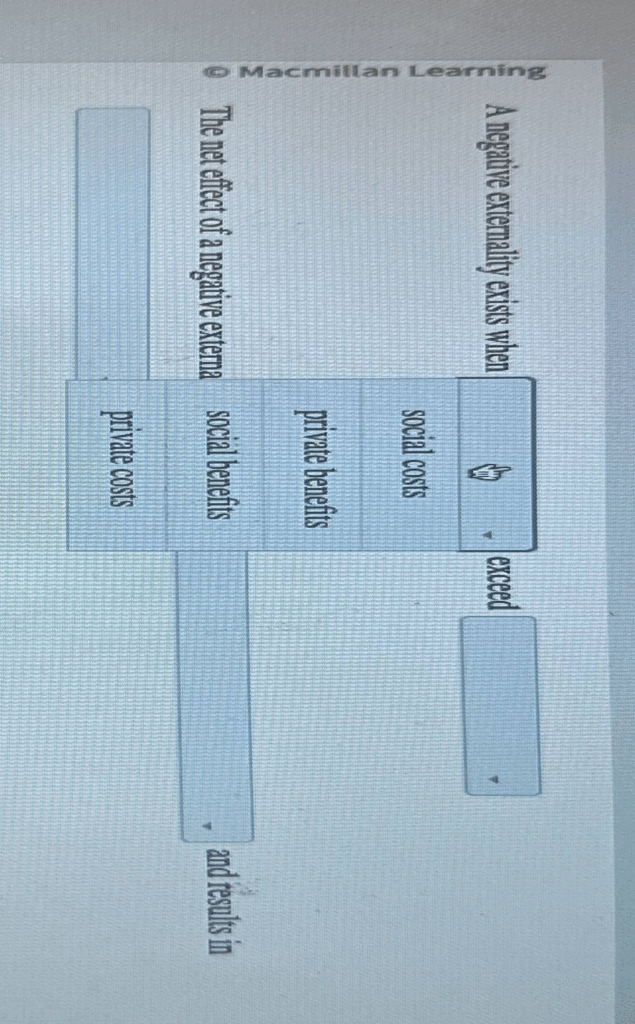 A negative externality exists when social costs exceed private benefits. The net effect of a negative externality results in social benefits and private costs.