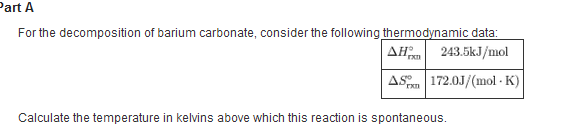 For the decomposition of barium carbonate, consider the following thermodynamic data: Calculate the temperature in kelvins above which this reaction is spontaneous. Calculate the equilibrium constant for the following reaction at room temperature, 25 degree C: BaCO3(s) rightarrow BaO(s) + CO2(g) Express your answer numerically to three significant figures. Barium oxide, BaO, is manufactured by decomposition of barium carbonate, BaCO3, in a furnace: BaCO3(s) rightarrow BaO(s) + CO2(g) The heat produced by a furnace maintained at a temperature of 600 K can decompose barium carbonate to barium oxide. The spontaneity of a reaction can be determined from the free energy change for the reaction, Delta G degree degree.