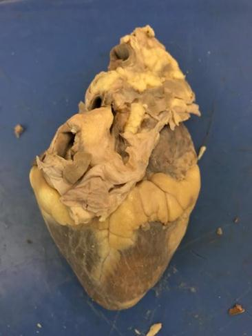 This image presents the anterior view of a preserved sheep heart, commonly used in anatomy and physiology studies due to its similarity in structure to the human heart. The heart apex, located at the bottom, points downward and to the left, which helps to determine anatomical orientation.