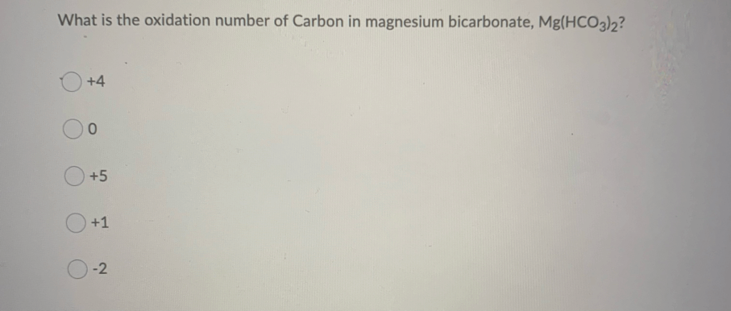 To determine the oxidation number of carbon in magnesium bicarbonate, Mg(HCO₃)₂, we need to examine the structure and charges within the compound.
