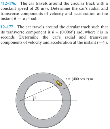 None None *12-176. The car travels around the circular track with a constant speed of 20 m/s. Determine the car’s radial and transverse components of velocity and acceleration at the instant = Ï€/4 rad. 12-177. The car travels around the circular track such that its transverse component is 0 (0.0062) rad, where t is in seconds. Determine the car’s radial and transverse components of velocity and acceleration at the instant = 4 s. O r = (400 cos 0) m