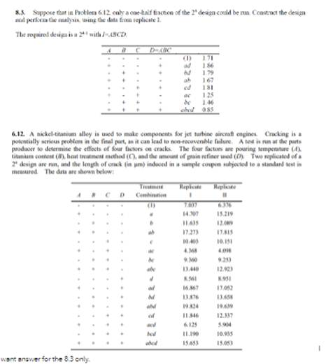 To solve Problem 8.3, we construct and analyze a one-half fraction of the 242^4 factorial design using the defining relation I=ABCDI = ABCD, and only replicate I data from Problem 6.12.