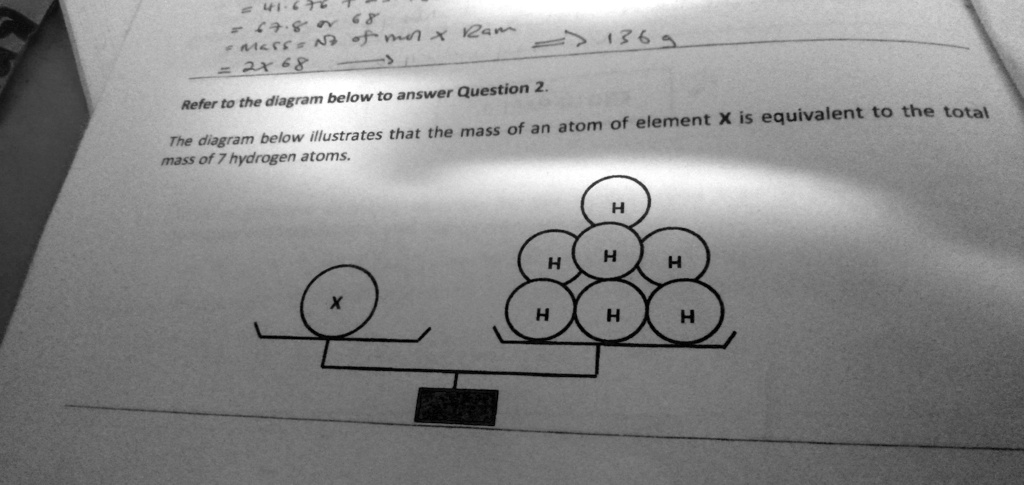 = 41.676 = 67.8 or 68 mass = No of mol x Ram = 2x68 Refer to the diagram below to answer Question 2. The diagram below illustrates that the mass of an atom of element X is equivalent to the total mass of 7 hydrogen atoms. H H H H X H H H